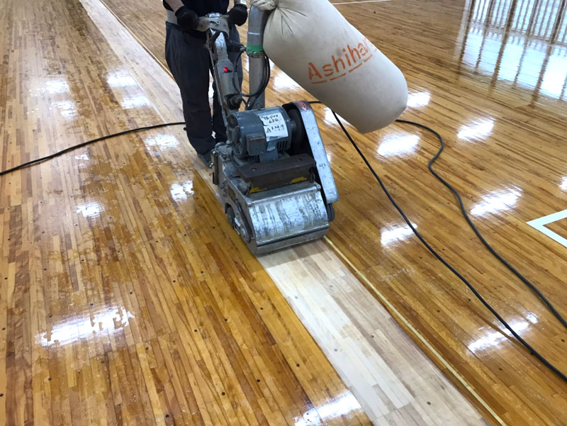 既存床表面のコーティングがめくれ、凸凹がでてきたので床を平滑にし、安心して競技できるよう環境を整えます。