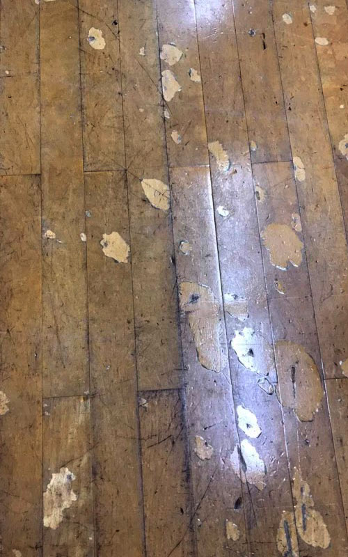 施工前、研磨作業前です。床が多く傷んでおり、樹脂塗料が剥げてきています。