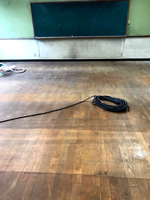 施工前、研磨作業前です。元々倉庫だった部屋を教室に変える為、二足制のウレタン床に再生しました。