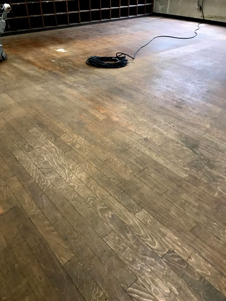 ドラムサンダーという機械を使って、フローリングの表面を削り研磨していきます。