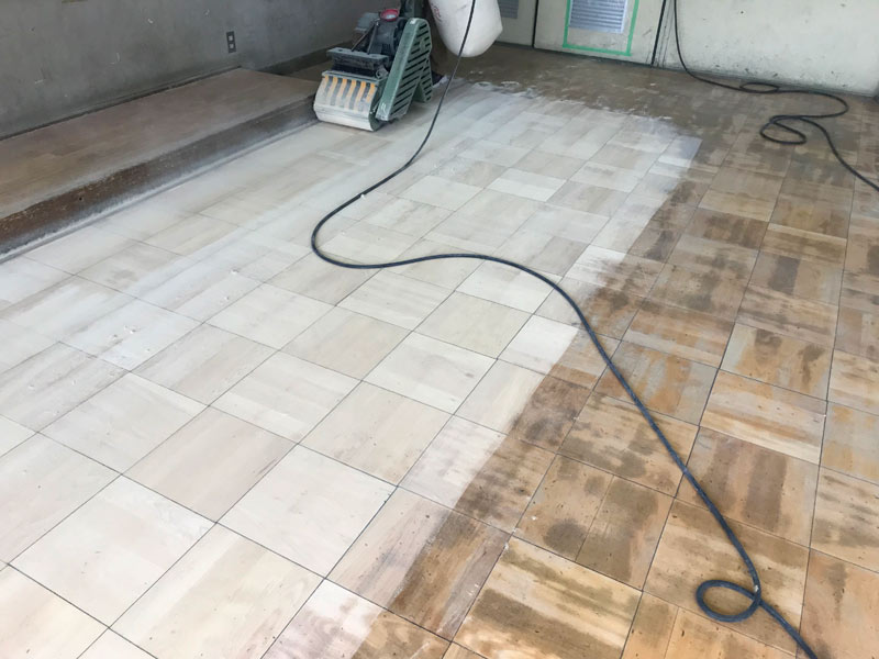ドラムサンダーという機械を使って、フローリングの表面を削り研磨していきます。
