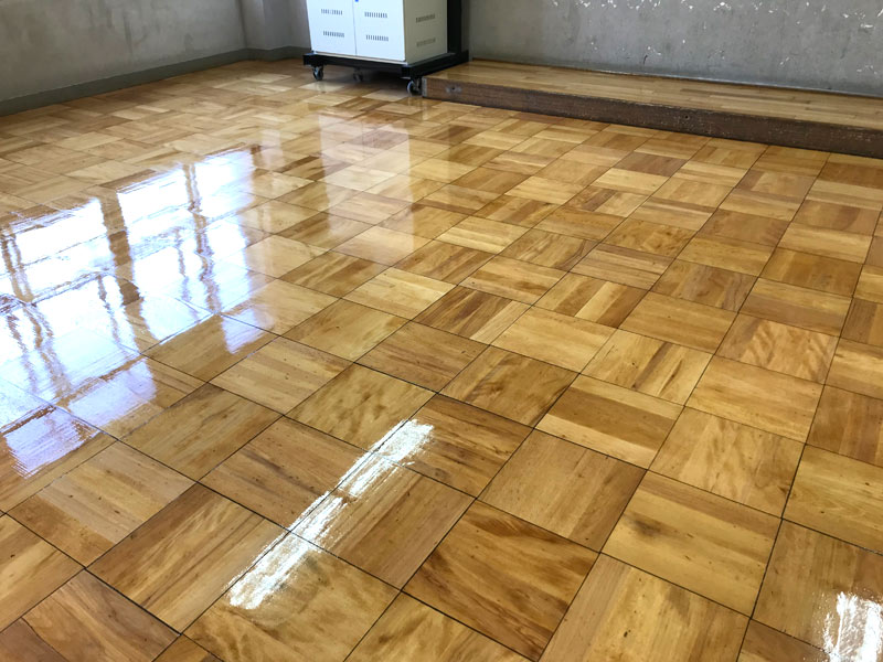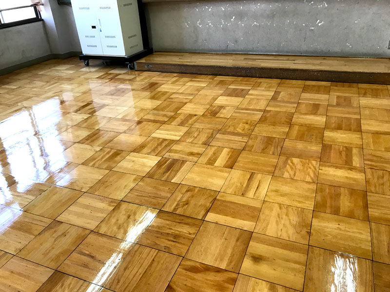 教室施工前、研磨作業前です。床が多く傷んでおり、樹脂塗料が剥げてきています。黒ずみが目立ちます。
