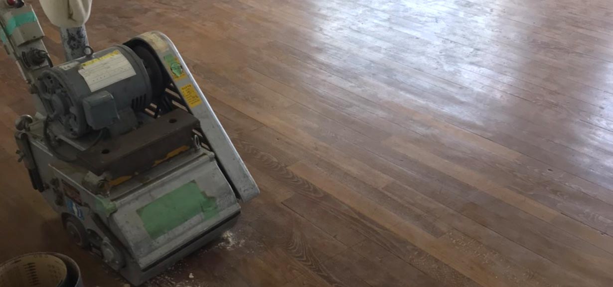 ドラムサンダーという機械を使って、フローリングの表面を削り研磨していきます。