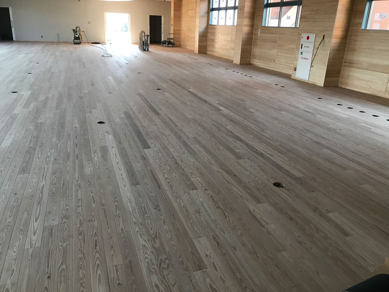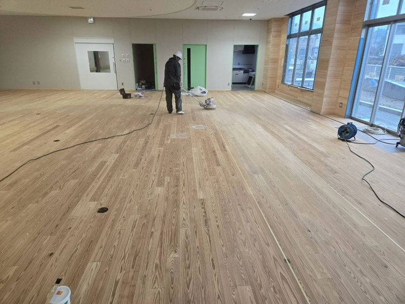新築施設でフローリングを張り、不陸調整及び表面フローリングを1枚削ってきれいな表面をだします。