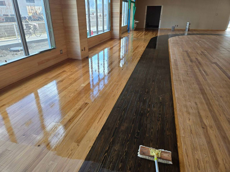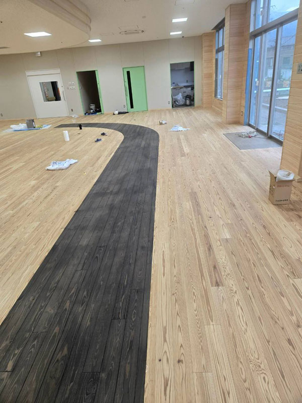 このように、研磨、ライン引き、着色、ウレタン塗装と全てにおいて、会社堀田では熟練者による施工が行えます。