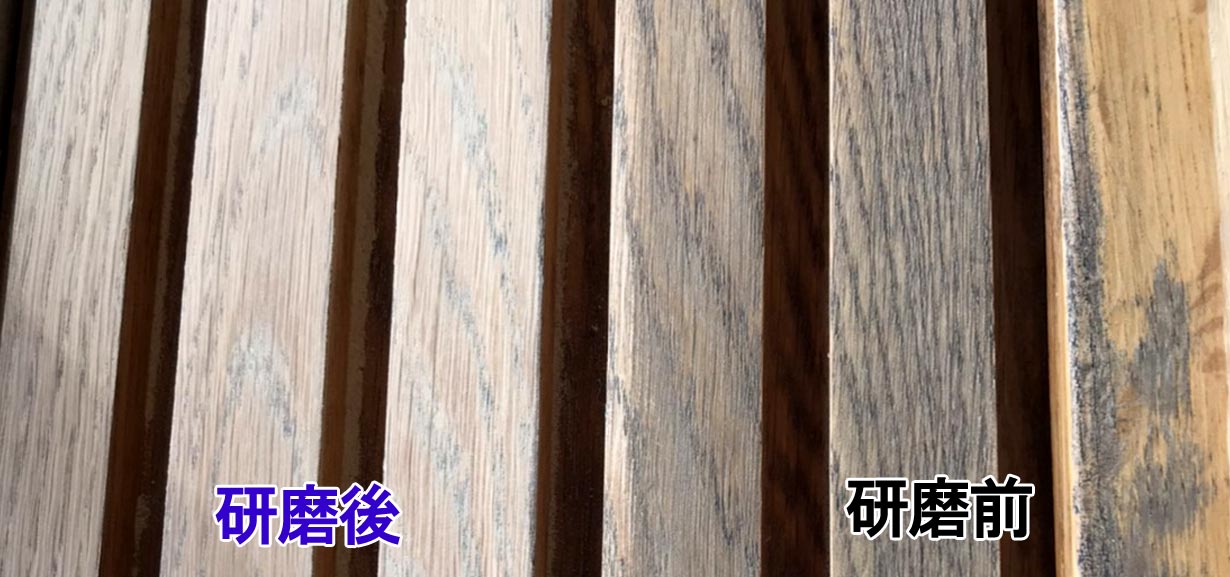 施行前、研磨作業前です。床が傷み汚れも目立ちます。特に使用頻度の高い窓側は黒ずみが目立ちます。