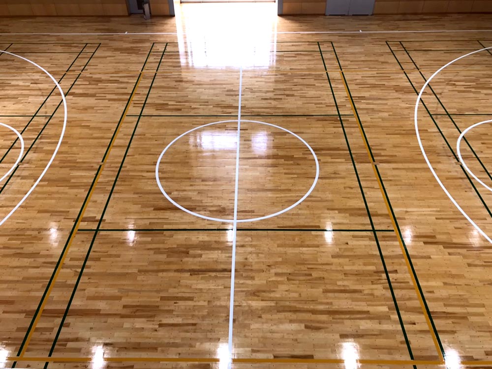 | 施工内容 | 木床の反り返りやヒビ等の一部改修 研磨樹脂塗装ライン引き |