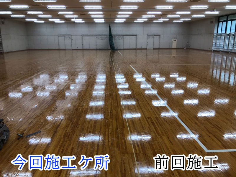以前に右側、剣道コートは上塗りライン引きの施工をしました。