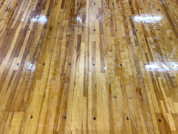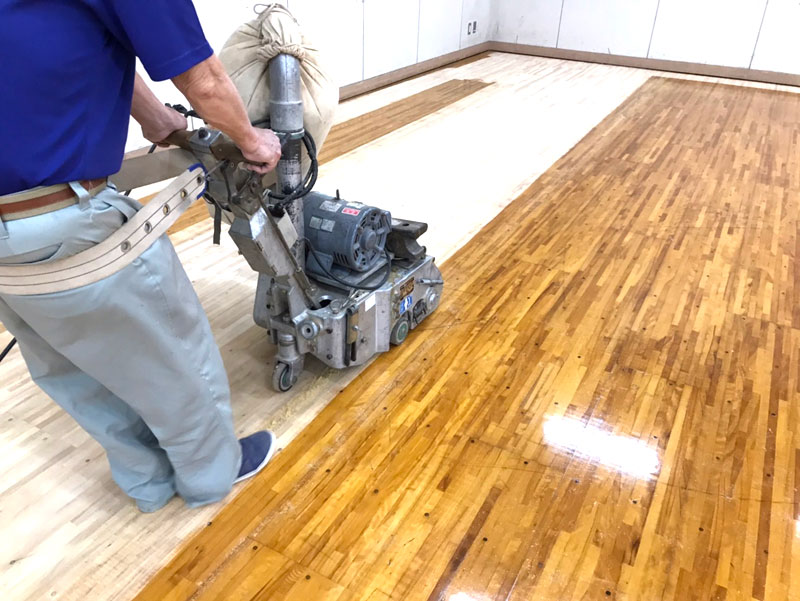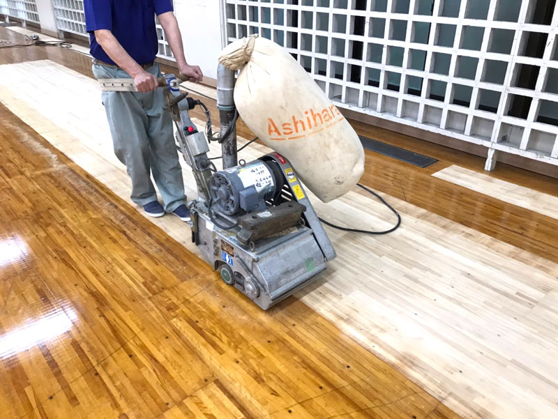 既存床表面のコーティングがめくれ、凸凹がでてきたので床を平滑にし、安心して競技できるよう環境を整えます。