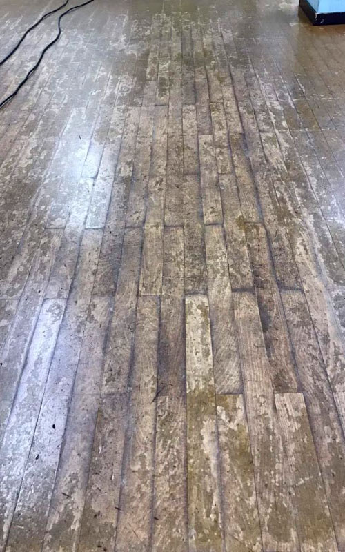 施工前、研磨作業前です。床が多く傷んでおり、樹脂塗料が剥げてきています。