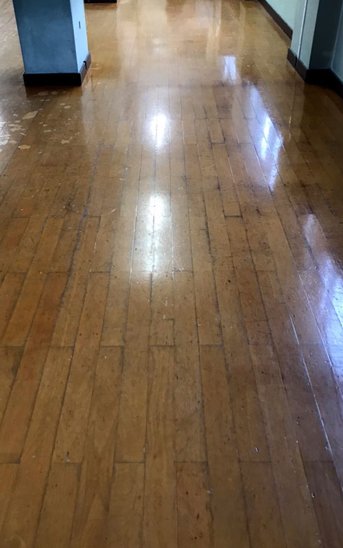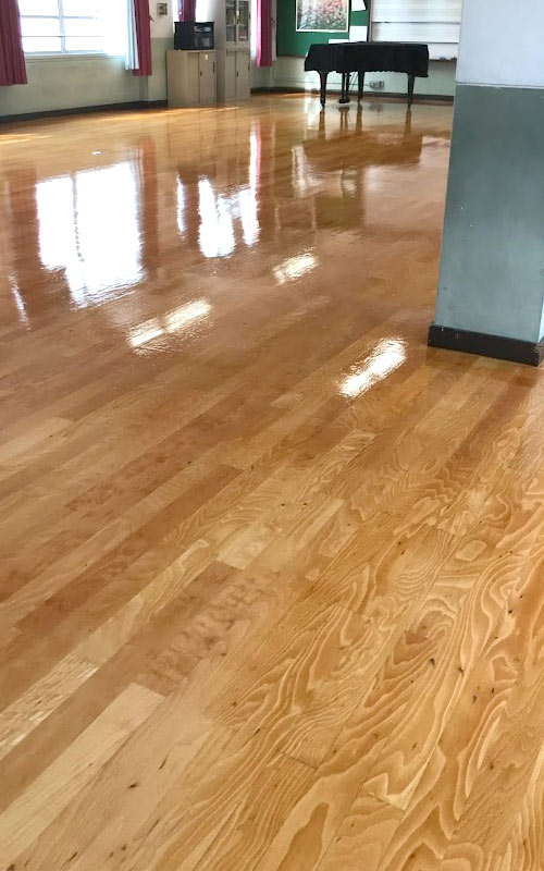 単板という非常に薄い木床でしたが、張替ではなく研磨により床をよみがえさせます。株式会社堀田の長年の研磨技術でしたら可能です。張替になってしまうと時間もコストもかかります。事前調査で床の状態をお調べして、単板でも研磨が可能とご説明させて頂き施工いたしました。