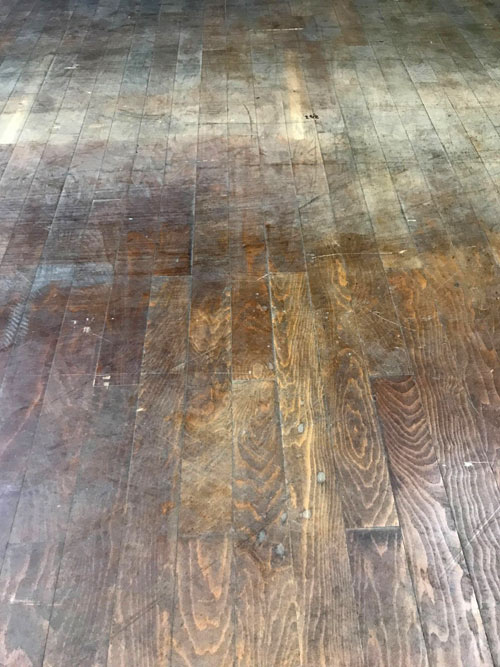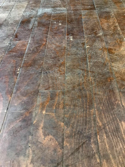 長年倉庫として使用していた為、床の黒ずみ、汚れ、きずが目立ちます。