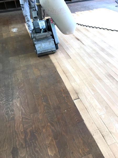 ドラムサンダーという機械を使って、フローリングの表面を削り研磨していきます。