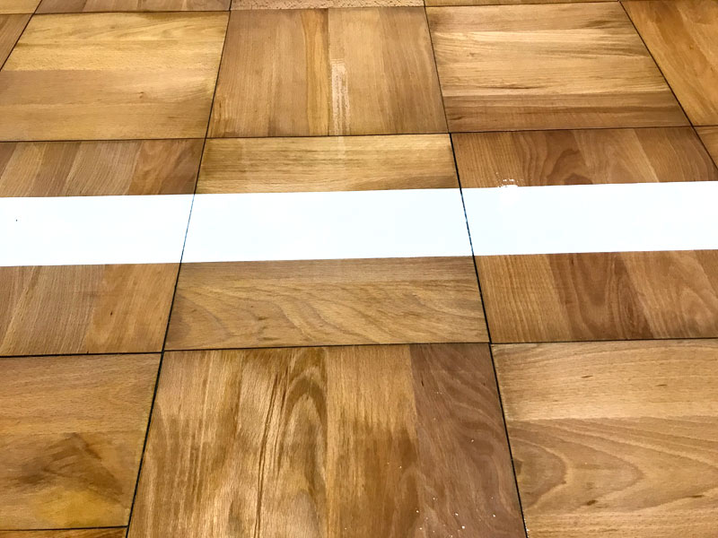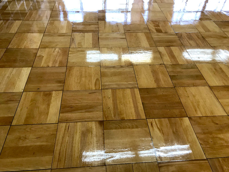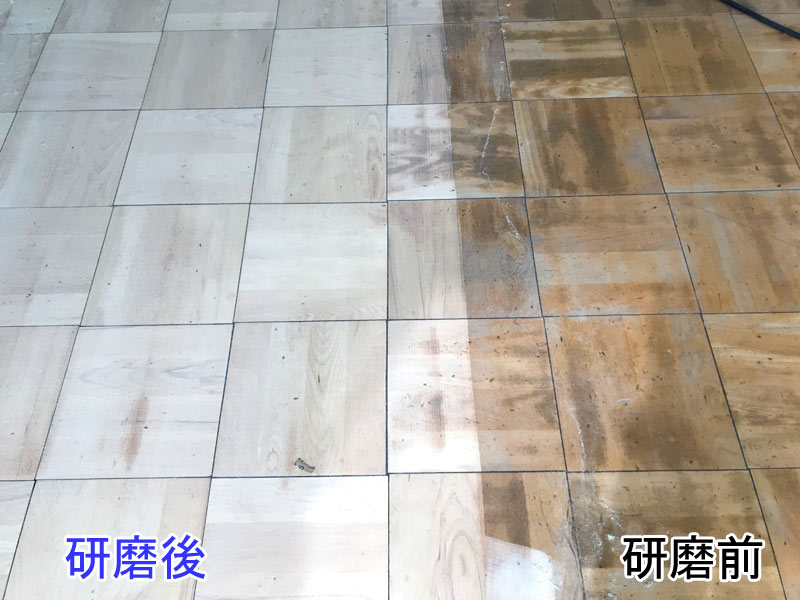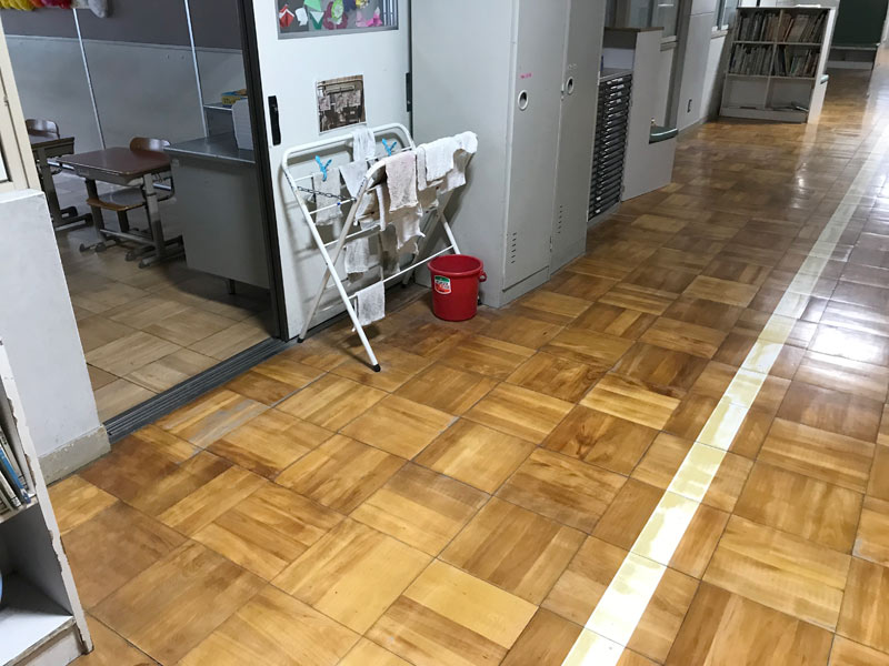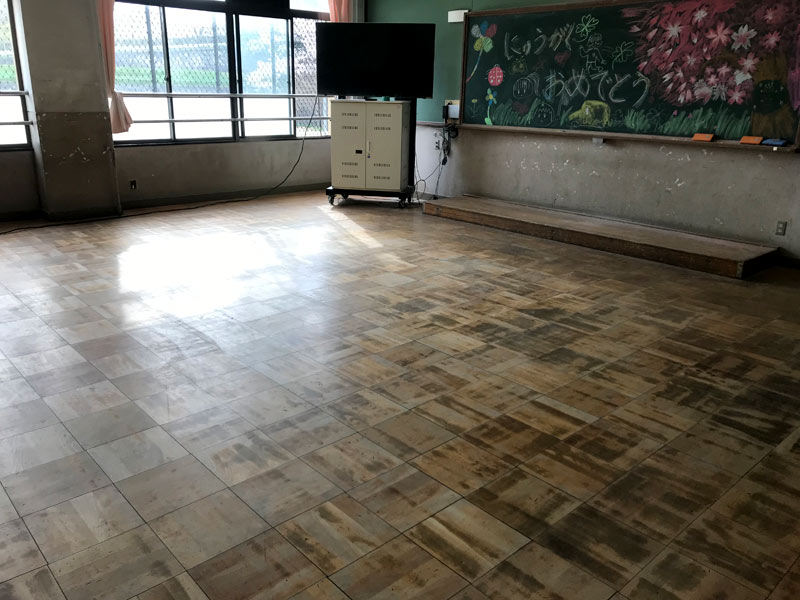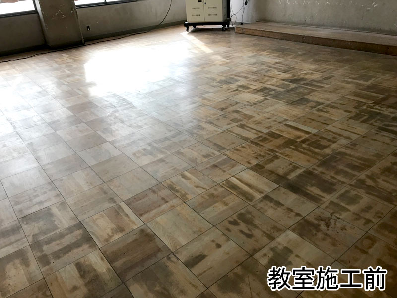 教室施工前、研磨作業前です。床が多く傷んでおり、樹脂塗料が剥げてきています。黒ずみが目立ちます。