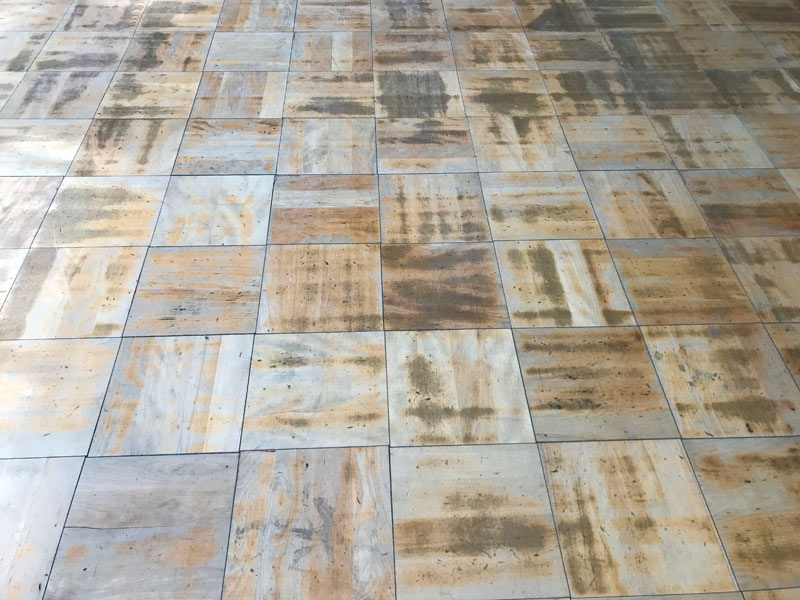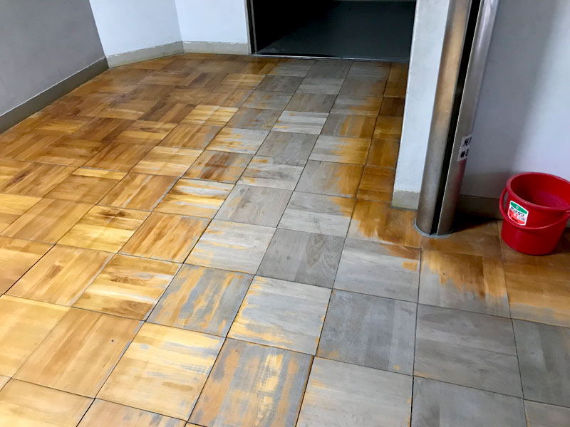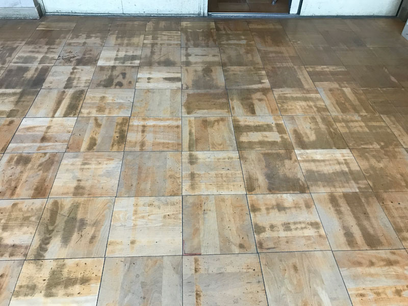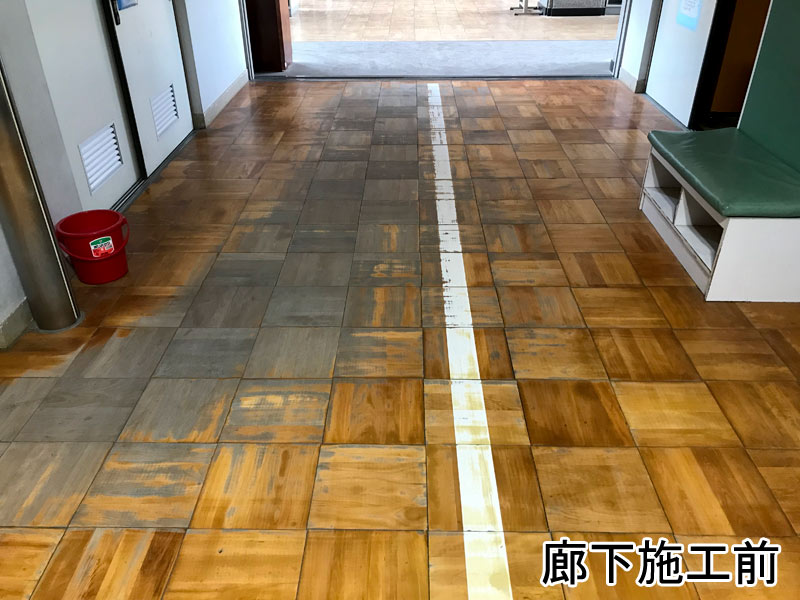 廊下の施工前、研磨作業前です。人がよく通るところは樹脂塗料がうすくなり下地が出て、黒ずみが目立ちます。