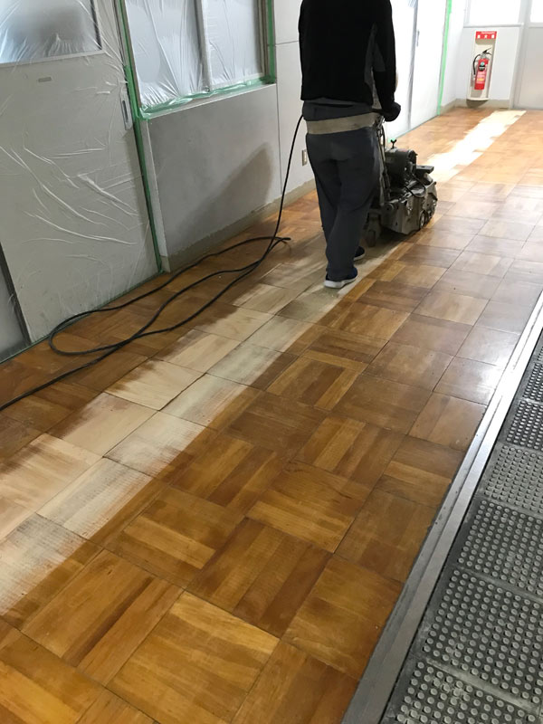 ドラムサンダーという機械を使って、フローリングの表面を削り研磨していきます。