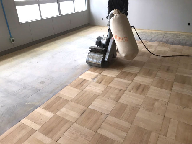 ドラムサンダーという機械を使って、フローリングの表面を削り研磨していきます。