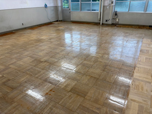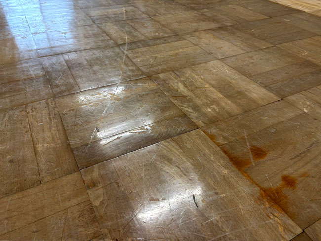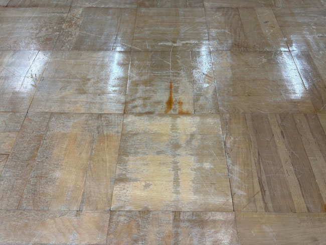 施工前、研磨作業前です。床が多く傷んでおり、樹脂塗料が剥げてきています。