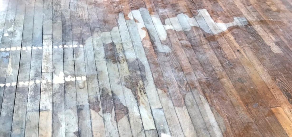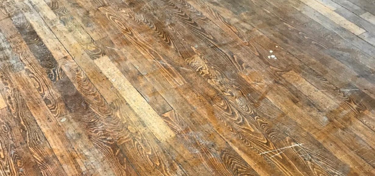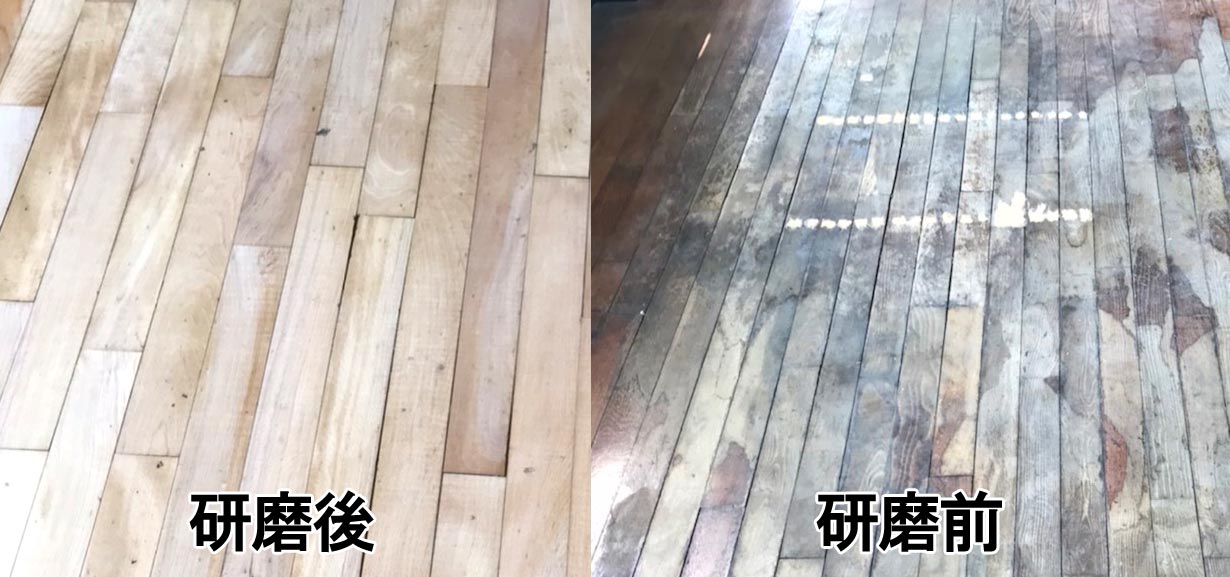 施工前、研磨作業前です。床が傷み汚れも目立ちます。しっかりと養生してから行います。