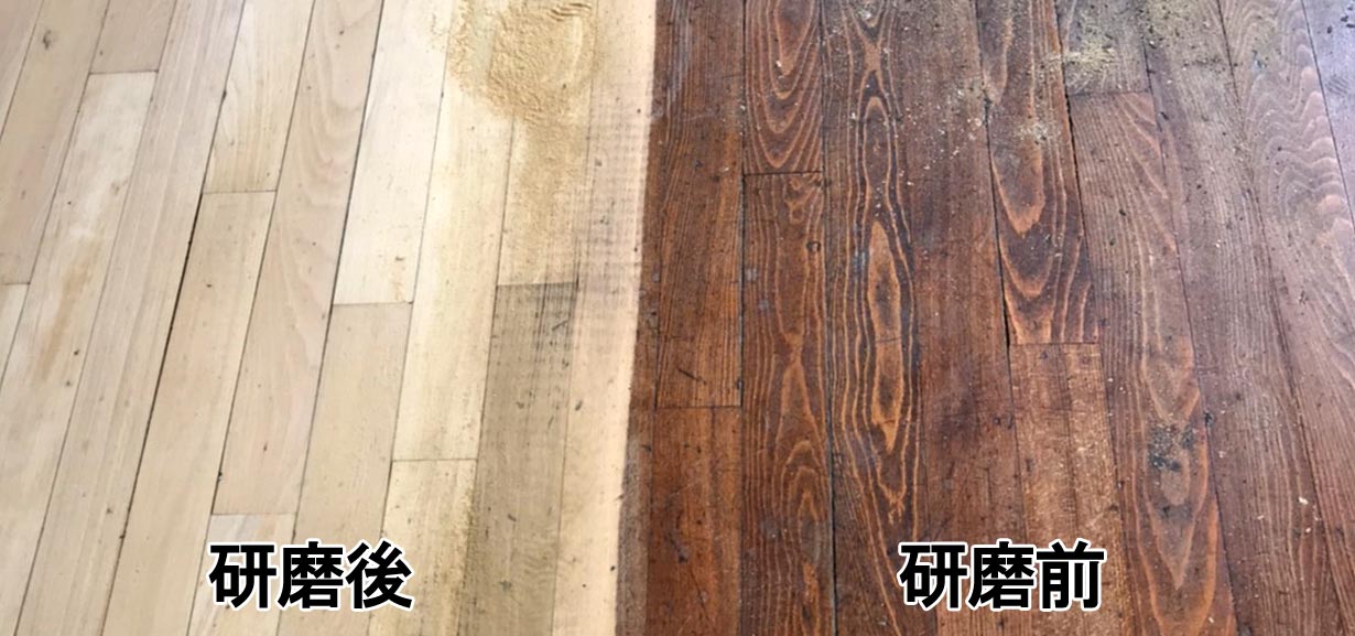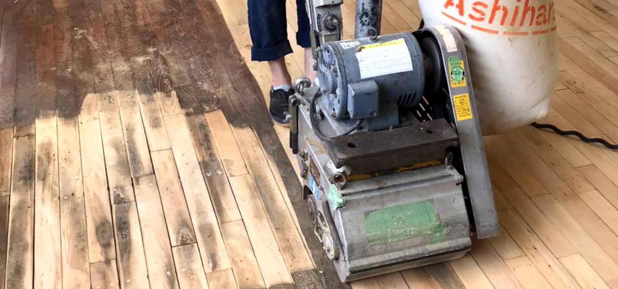 ドラムサンダーという機械を使って、フローリングの表面を削り研磨していきます。