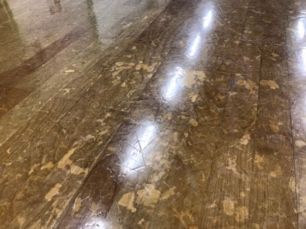 施行前、研磨作業前です。ご依頼主様が自らワックスを塗っていて、大変滑りやすくなっている状態でした。床が傷や汚れも目立ちます。
