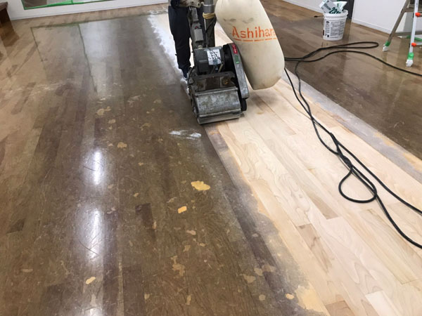 ドラムサンダーという機械を使って、細かく調整をしながらフローリングの表面を削り研磨していきます。