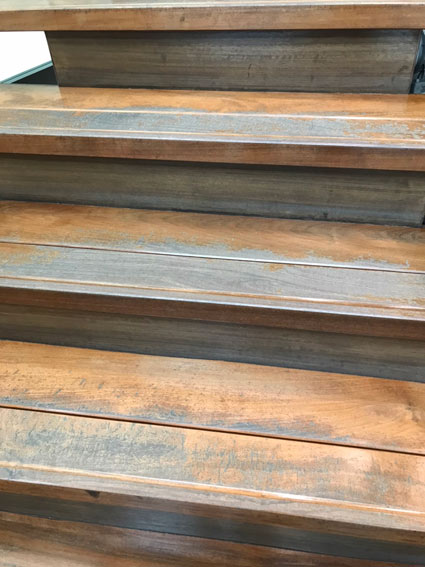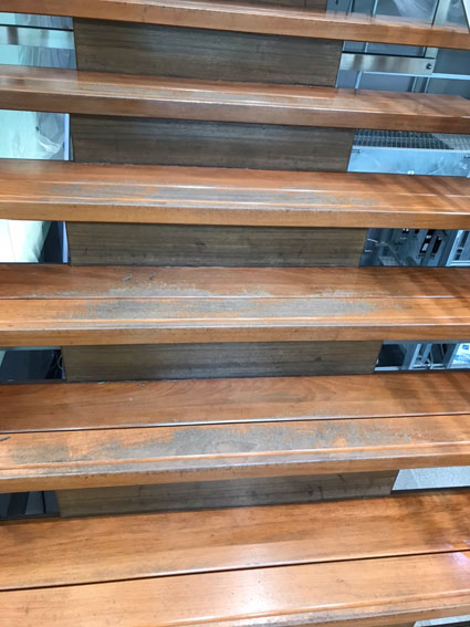 階段はけものみちの歩行が多く黒ずみが目立ちます。階段のたて面や隅々まで施工します。