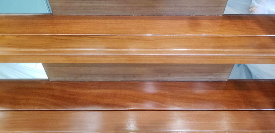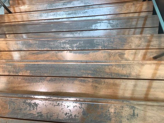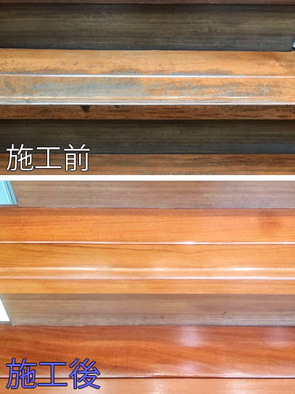 施工前、研磨作業前です。玄関ホール階段は人がよく通る場所はコーティングがすり減り、汚れが入り込み黒ずんでいます。床が傷み汚れも目立ちます。