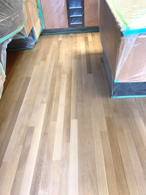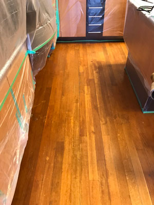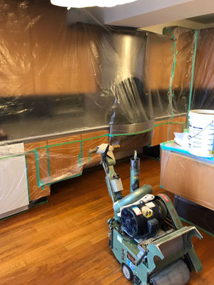 ドラムサンダーという機械を使って、フローリングの表面を削り研磨していきます。
