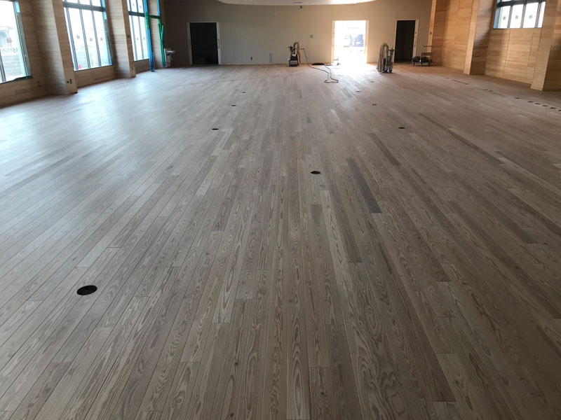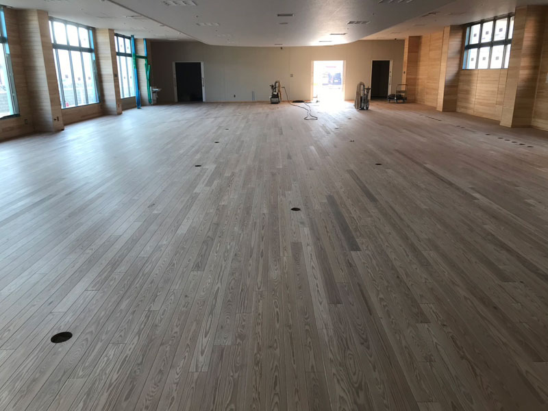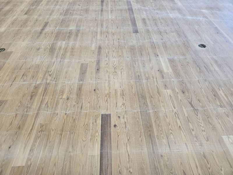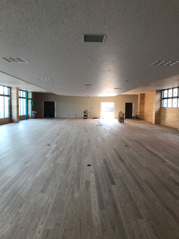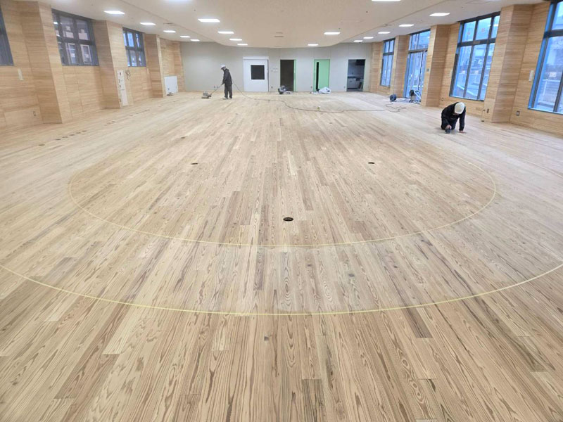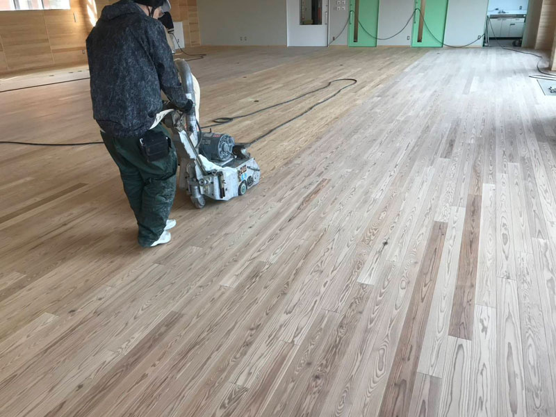 新築施設でフローリングを張り、不陸調整及び表面フローリングを1枚削ってきれいな表面をだします。