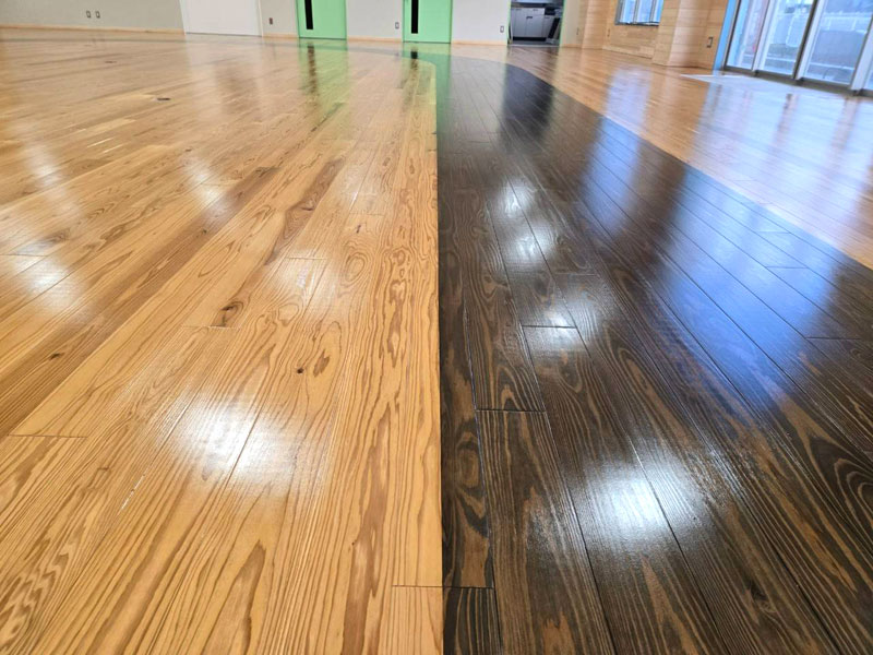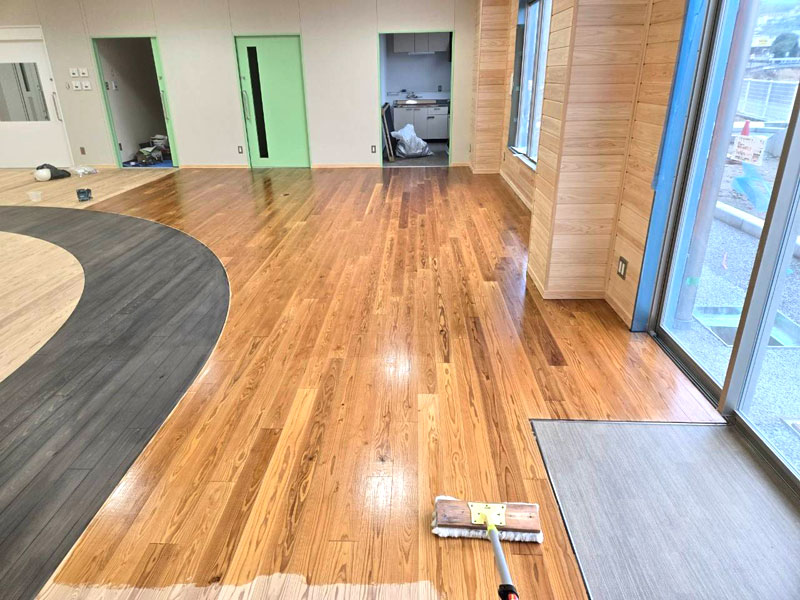| 施工内容 | 不陸調整及表面フローリング研磨・着色後水性2液ウレタン仕上げ |