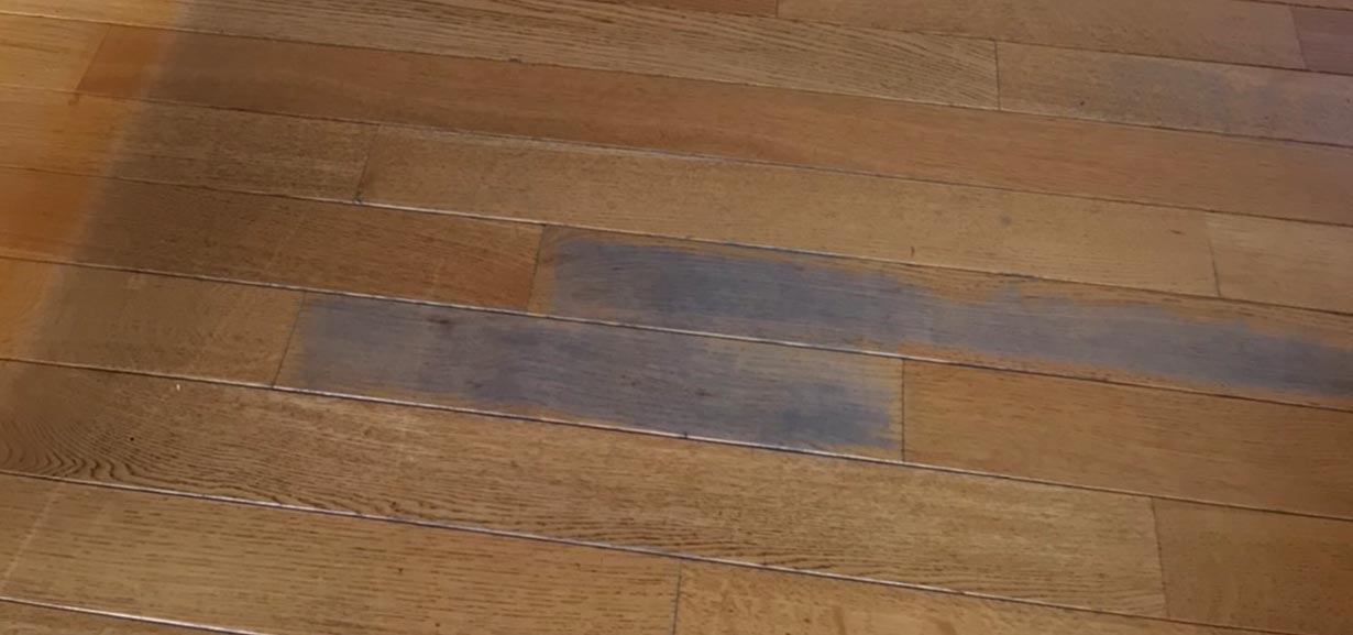 施行前、研磨作業前です。床が傷み汚れも目立ちます。特に使用頻度の高い窓側は黒ずみが目立ちます。