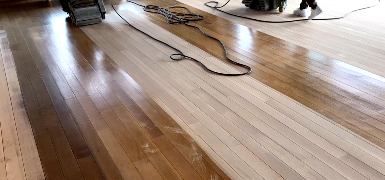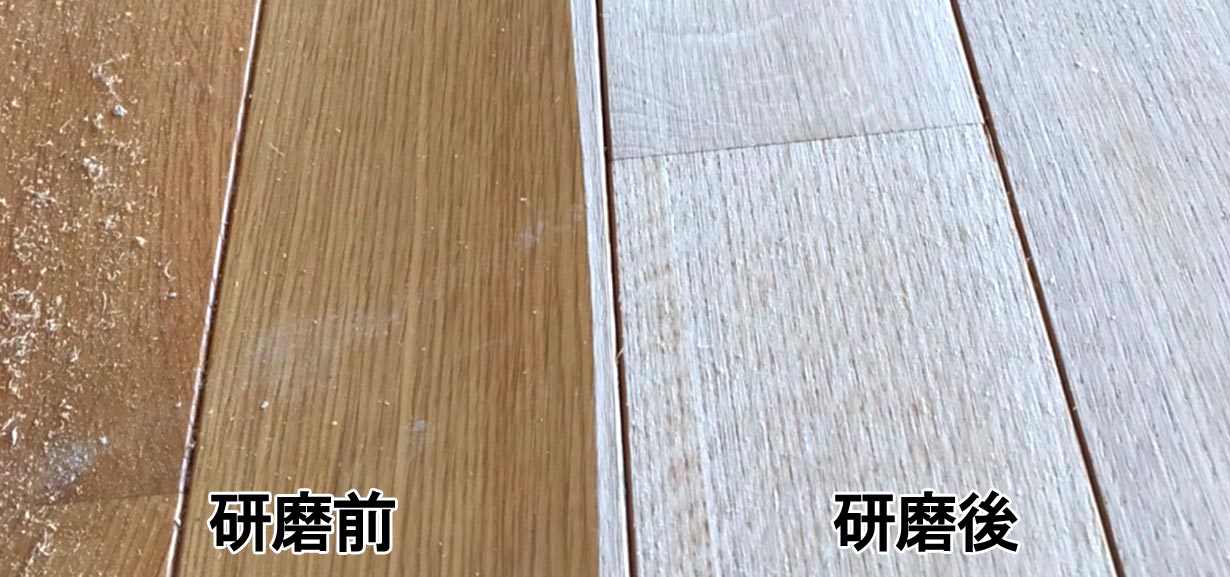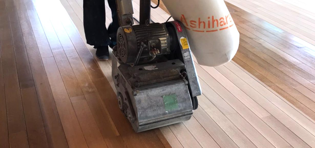 ドラムサンダーという機械を使って、フローリングの表面を削り研磨していきます。