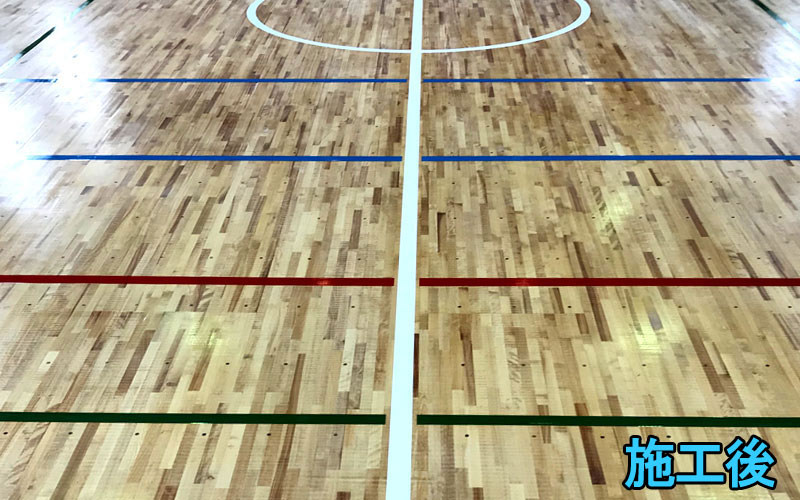 木床張り替え作業となると時間も費用もかかり難しいですが、株式会社堀田では研磨塗装作業により床再生を行うので、格段に費用を抑えることができ、 ご要望があればコートライン引きまで一括施工、短い日程で作業を完了することが出来ます。