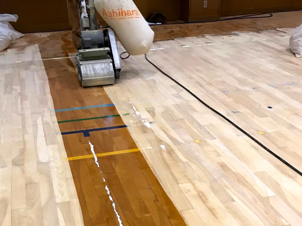 | 施工内容 | 木床の反り返りやヒビ等の一部改修 研磨樹脂塗装ライン引き |